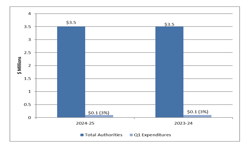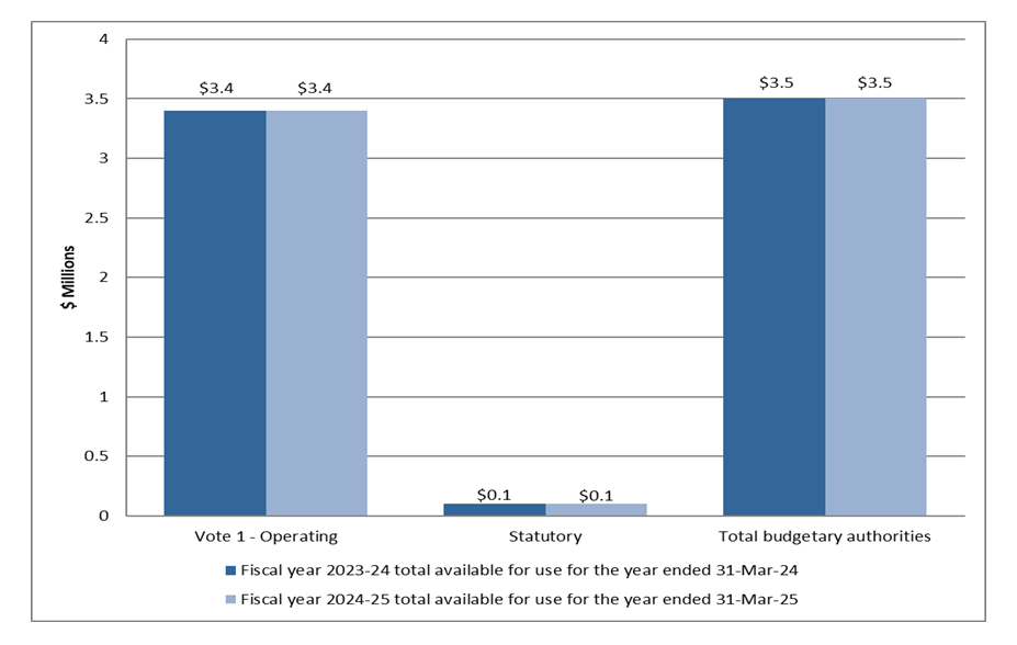 As per graph 2 below as at June 30, 2024 and Annex A, presented at the end of this document, the Commission has authorities available for use of $3.5 million in 2024-25 compared to $3.5 million as of June 30 2023. The authorities of $3.5 million have remained consistent from 2024-25 compared to 2023-24 due to the funding that is accessible to organize leader's debates should a federal general election be called.