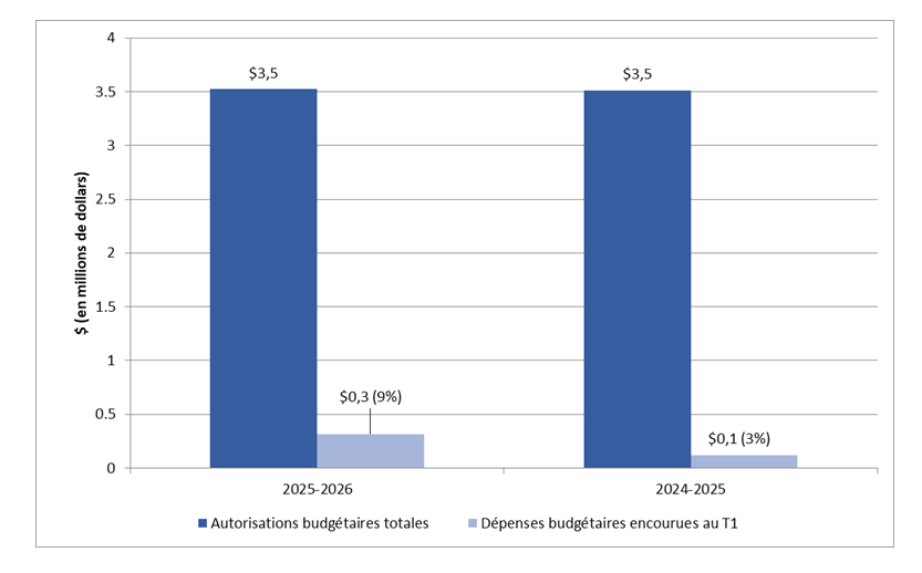 Les dépenses cumulatives comptabilisées à la fin du premier trimestre ont augmenté de 201 000 $ ou de 175 %, comparativement à la même période de l’exercice précédent (elles ont passé de 115 000 $ en 2024-2025 à 316 000 $ en 2025-2026). Le tableau 1 ci-dessous présente les dépenses budgétaires par article courant.