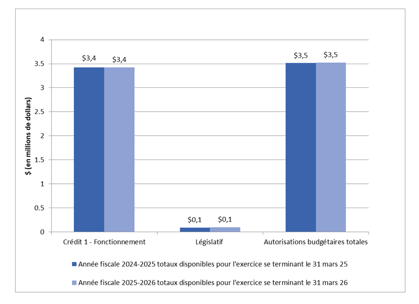 D’après le graphique 2 ci-dessous en date du 30 juin 2025 et l’annexe A, qui se trouve à la fin de ce document, les autorisations totales dont dispose la Commission s’élèvent à 3,5 millions de dollars en 2025-2026, comparativement à 3,5 millions de dollars au 30 juin 2024. Les autorisations de 3,5 millions de dollars sont restées constantes entre 2025-2026 et 2024-2025 principalement dû au financement accessible pour organiser les débats des chefs en cas de déclenchement d'élections générales fédérales.